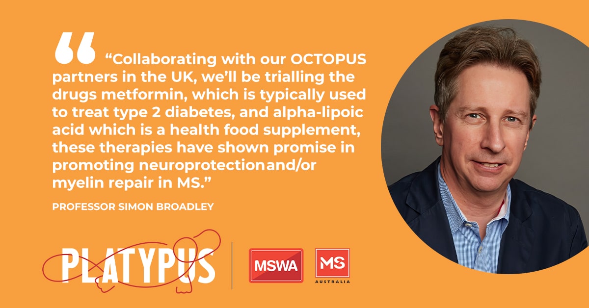 MSWA is the leading funder of the trial having contributed $3 million to PLATYPUS. MSWA CEO Melanie Kiely said MSWA is proud to fund the ambitious research project which will transform the way we test treatments for progressive MS.